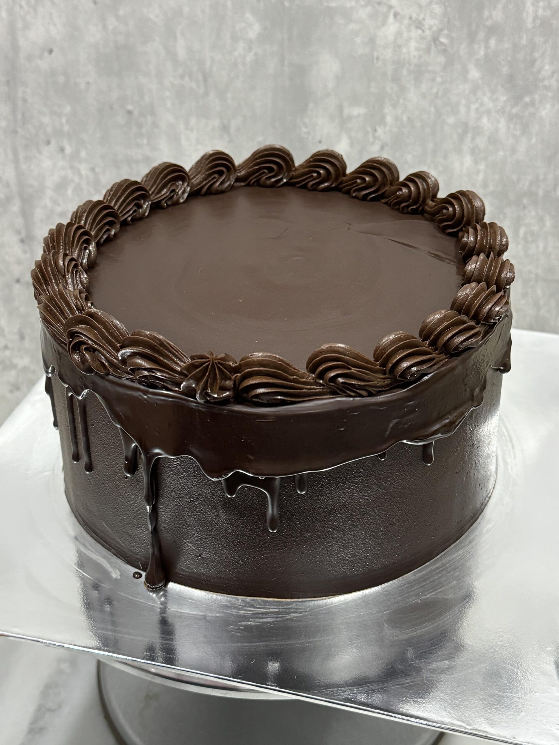 The cake ~ 920 gram, the Ganache ~ 300 gram (Total ~ 1.2 kg)
