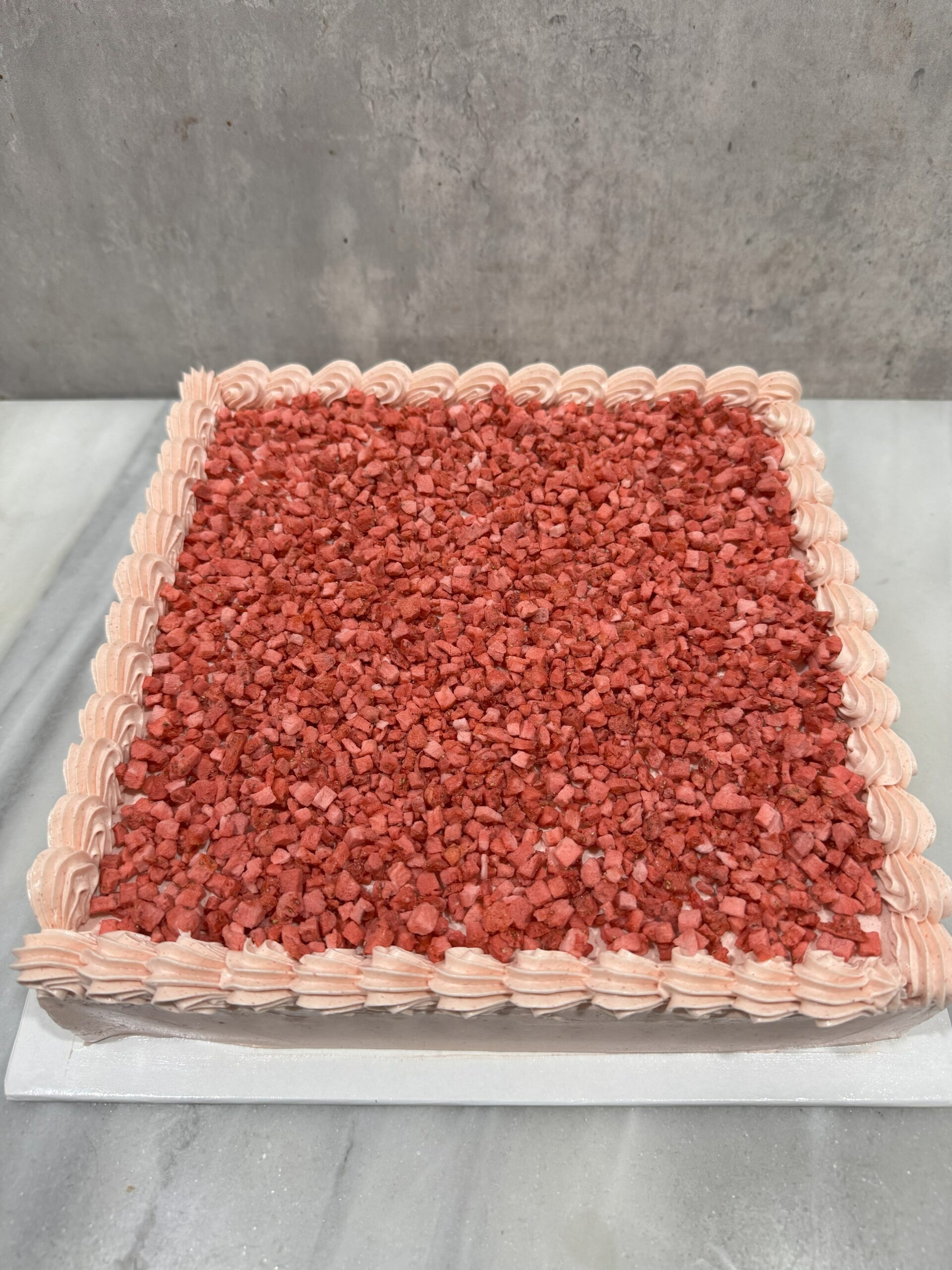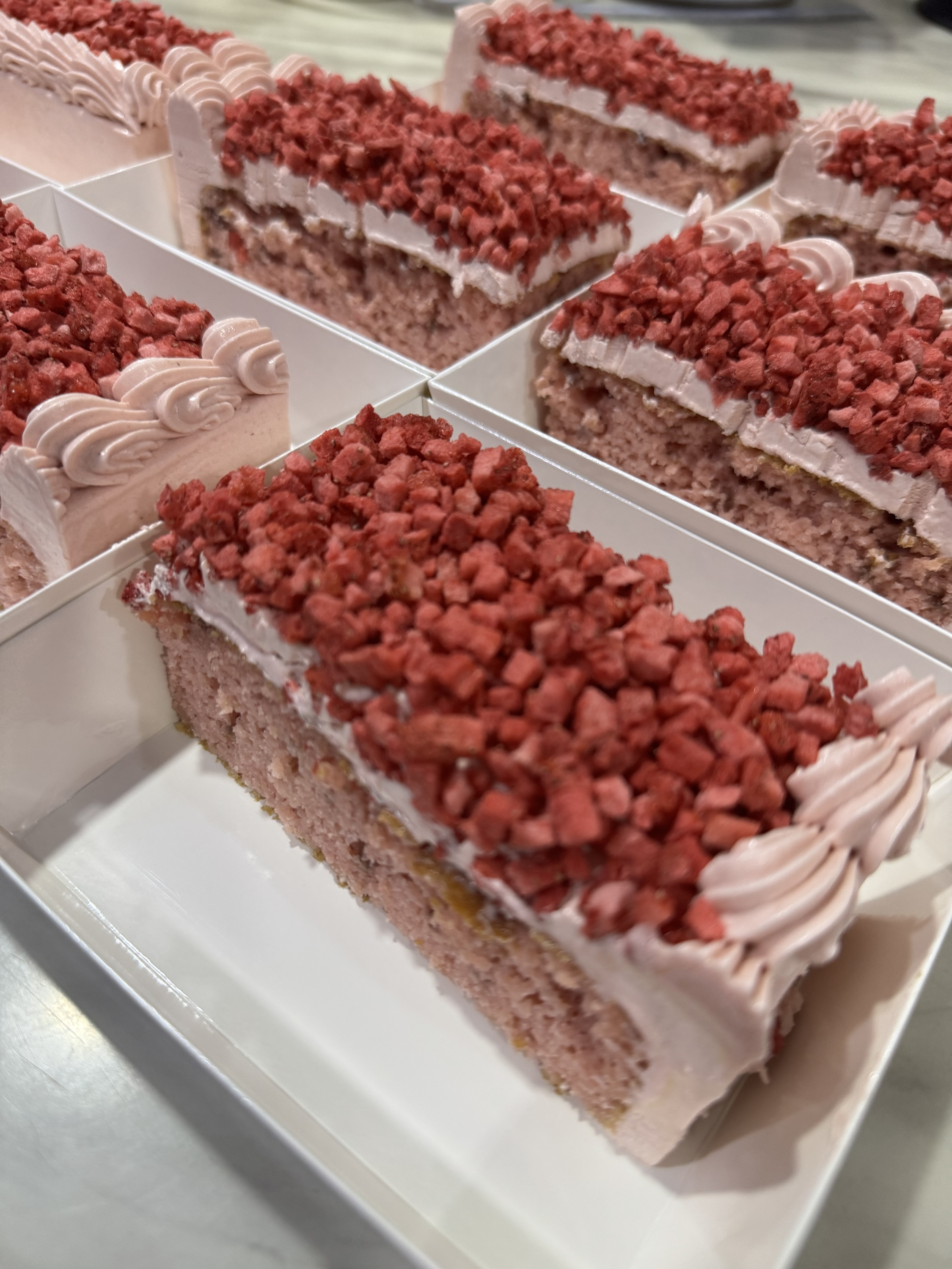For Cake – Almond Flour, Lakanto as Sweetener, Vegetable Oil (Palm Oil), Eggs, Baking Powder, Vinegar, UHT Heavy Cream (DAIRY FREE option will be using Coconut Cream), Freeze Dried Strawberry, Vanilla Extract